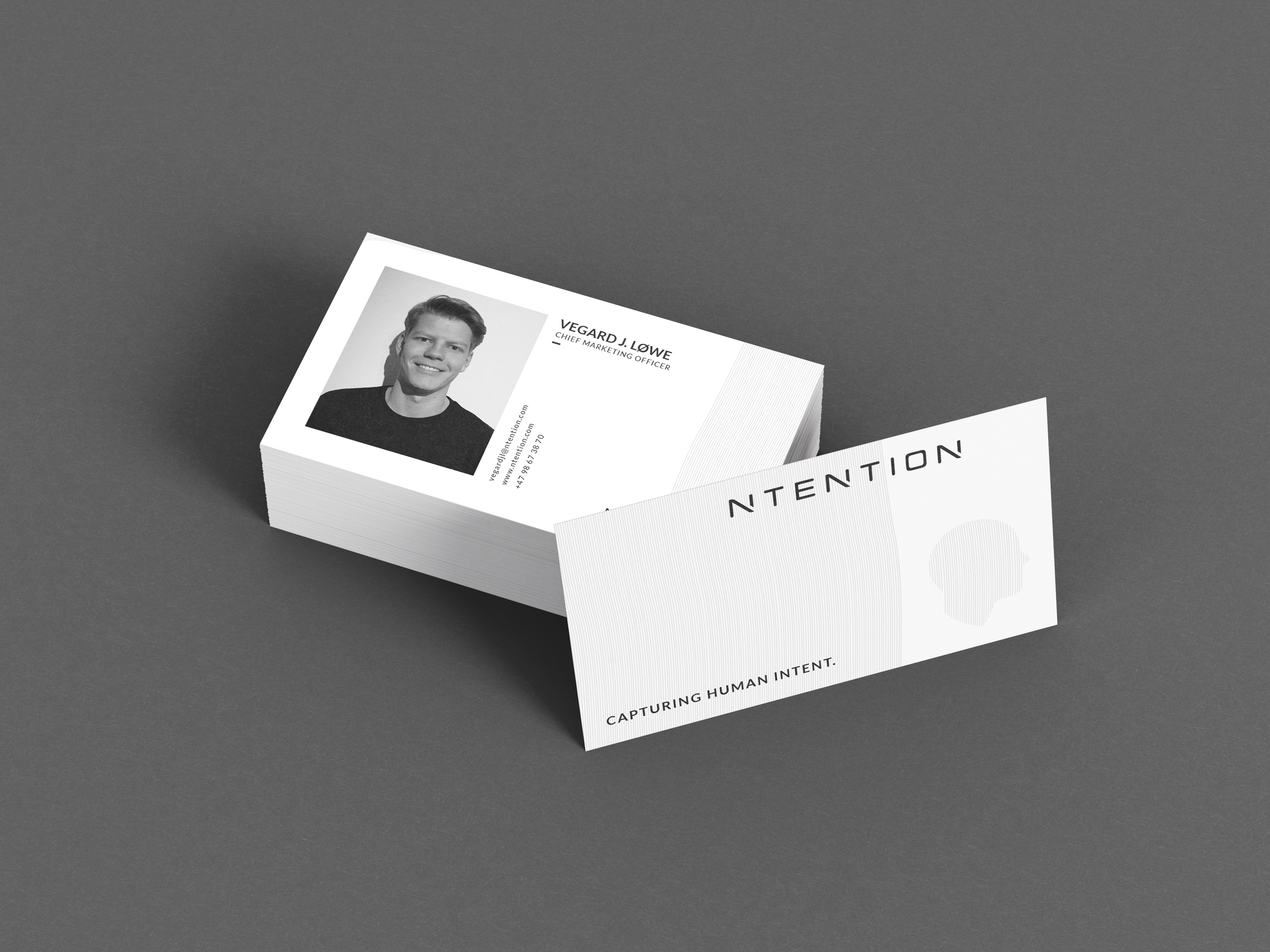 The task for this project was to design business cards for the Norwegian start-up Ntention. Ntention works with innovative technology within human-machine interaction and it is precisely this communication that should be prominent in the design of the business cards. Other important key hooks for the design are mysterious, simple and professional.